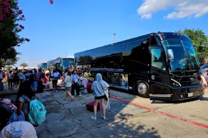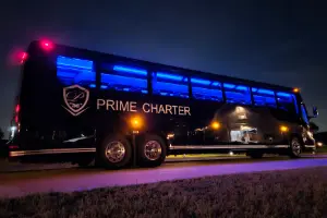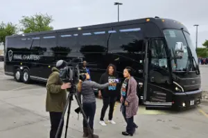 The charter buses are spacious with seats that have a lot of legroom and power outlets. The TV-monitors are connected to the same source and can show anything from Youtube videos to Netflix, Hulu and other Roku options. The buses use Starlink as internet connection.